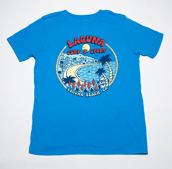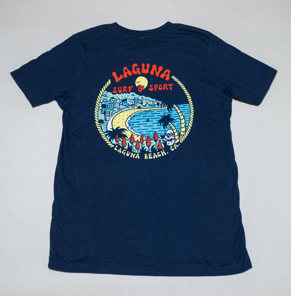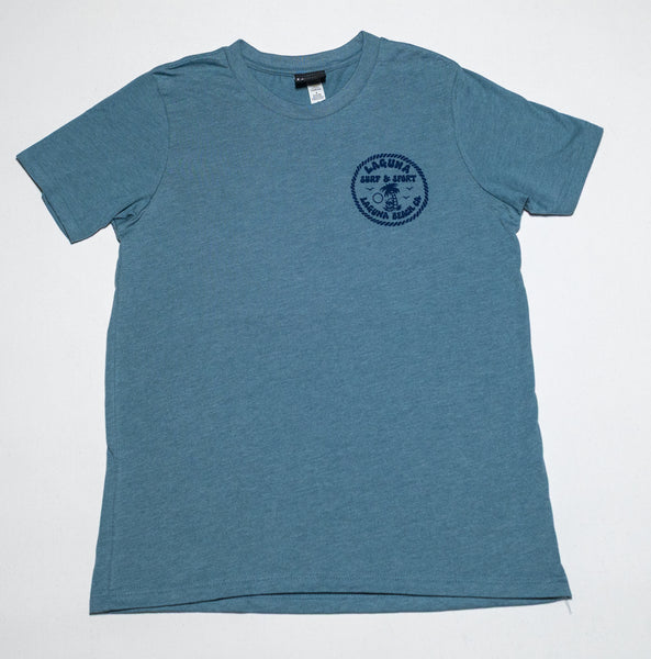 Unisex youth short sleeve tee made from super soft cotton, that has a small Laguna logo on front, and large Downtown logo on back.