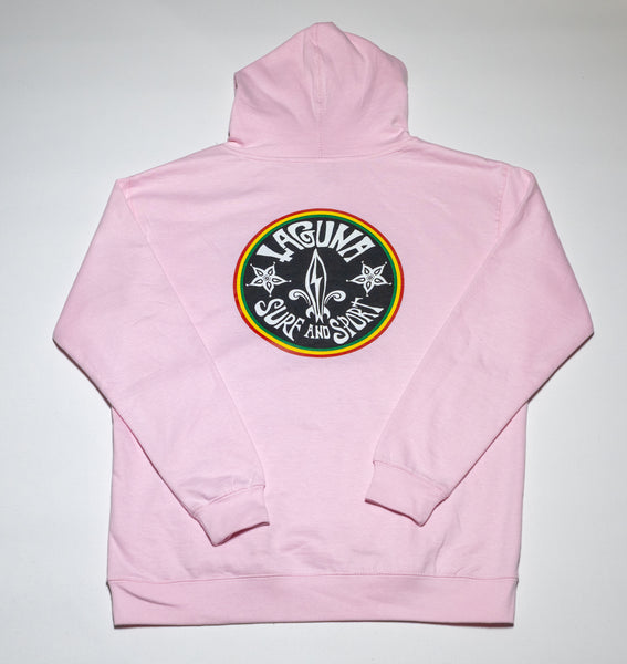 Lightweight, youth hooded sweatshirt with Circle Roots Rasta logo on chest, and "Laguna Surf & Sport" text down the left sleeve.