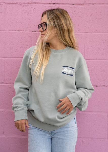 Lived-in, pigment-washed pullover crew featuring front pocket and drawstring hood with small LSS BOX LOGO on front, and large logo design on back.